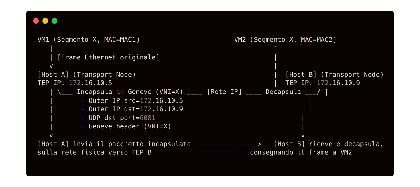 Nell’overlay Geneve, il frame originale della VM viene racchiuso in una nuova busta di rete (header outer) con indirizzi IP dei TEP. Il frame viaggia attraverso la rete fisica L3 come un normale pacchetto UDP/IP, per poi essere decapsulato dall’host remoto e riconsegnato alla VM destinataria.