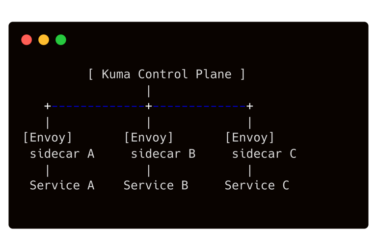 Nell'illustrazione: il Kuma CP controlla una serie di sidecar Envoy (DP) uno per ogni servizio/pod (A, B, C). Ogni sidecar proxy affianca un servizio applicativo e intercetta il traffico da e verso di esso, applicando le policy definite.