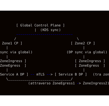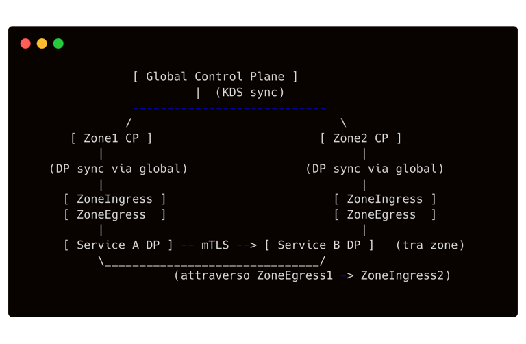 Nell’illustrazione: Abbiamo un Global CP che coordina due Zone CP. Ogni Zone CP gestisce i dataplane locali e fa girare un ZoneIngress (per ricevere traffico da altre zone) e, se abilitato, un ZoneEgress (per inviare traffico fuori dalla zona). I dataplane (DP) all’interno di una zona comunicano fra loro direttamente (richieste intra-zone), ma quando il servizio A (in Zone1) deve chiamare il servizio B (in Zone2), la richiesta viene intercettata dal ZoneEgress di Zone1, il quale stabilisce una connessione mTLS verso il ZoneIngress di Zone2. Da lì, il traffico raggiunge il DP del servizio B. Il Global CP diffonde a tutti i CP zone le informazioni necessarie (quali servizi sono attivi in quali zone, e gli indirizzi dei rispettivi ingress).