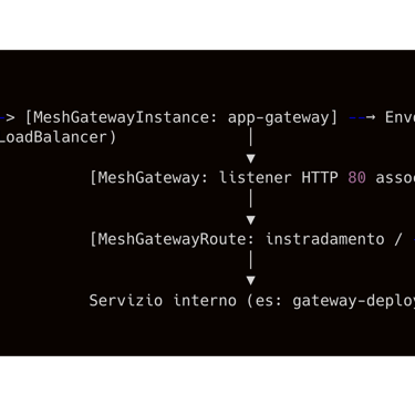 Infine, occorre creare la MeshGatewayRoute che instrada le richieste ricevute verso uno o più servizi del mesh interni. Ad esempio, se vogliamo che tutto il traffico HTTP in ingresso venga inoltrato a un servizio interno chiamato gateway-deployment (supponiamo sia un’applicazione web nel mesh), configureremo: