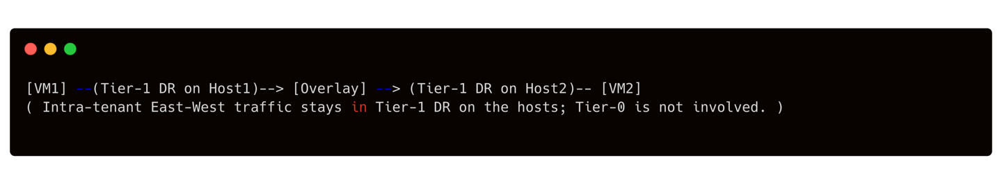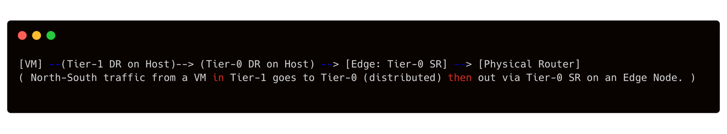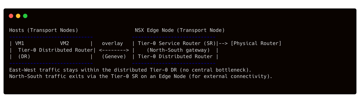 Nell'esempio single-tier sopra, il Tier-0 DR (Distributed Router) risiede su tutti gli host, instradando localmente il traffico tra VM (percorso east-west). Il Tier-0 SR (Service Router) risiede sull'Edge Node ed è responsabile di portare all’esterno il traffico destinato al physical router (percorso north-south).
