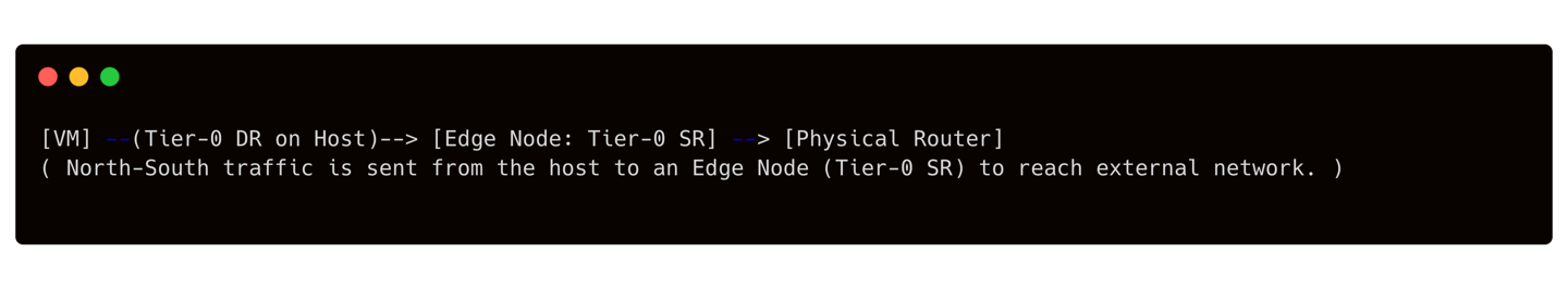 Nell'esempio, la VM invia il pacchetto al Tier-0 DR locale; poiché la destinazione è esterna, il Tier-0 DR instrada il pacchetto verso l’SR (Service Router) del Tier-0, che risiede su un Edge Node. Il pacchetto attraversa l’overlay (Geneve) fino all’Edge, dove l’SR lo riceve e lo inoltra sull’interfaccia uplink fisica connessa al Physical Router. Da lì prosegue secondo le rotte tradizionali fuori dal dominio NSX. Per il traffico di ritorno, il percorso è invertito: arriva sull’SR tramite l’uplink fisico, e l’SR conosce (via routing) le subnet delle VM quindi lo recapita all’host corretto attraverso il Tier-0 DR distribuito.