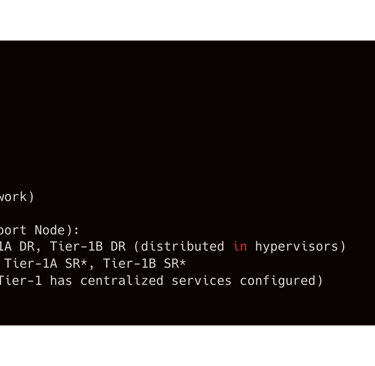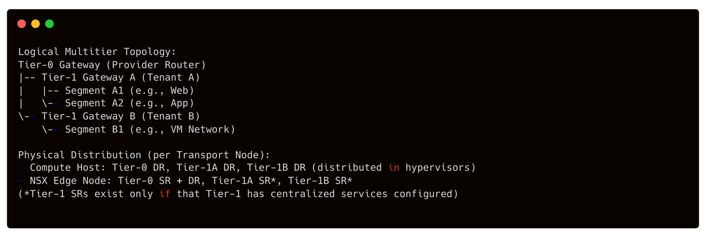 Come illustrato sopra, logicamente il Tier-0 sta al vertice ed è connesso a più Tier-1 (ciascuno tipicamente appartenente a un tenant o contesto diverso). Ogni Tier-1 serve uno o più segmenti logici (reti VM) del proprio tenant. Dal punto di vista fisico, su ogni host hypervisor esisterà un'istanza di Tier-0 DR e Tier-1 DR per ciascun Tier-1 configurato (nell’esempio, Tier-1A DR e Tier-1B DR girano su tutti gli host, oltre al Tier-0 DR). Ciò significa che il routing east-west di ogni tenant avviene localmente sugli host, all’interno del rispettivo Tier-1 DR. Sul nodo Edge, invece, girerà sempre il Tier-0 SR (necessario per il north-south) e, se un Tier-1 ha bisogno di servizi centralizzati (ad esempio NAT, DHCP o load balancer), verrà instanziato sul cluster Edge anche un Tier-1 SR per quel Tier-1. Nell'esempio fisico mostrato, il Tier-1A SR e Tier-1B SR sono indicati con l’asterisco ad indicare che sono presenti solo se richiesti – ad esempio, se il Tenant A avesse un NAT configurato sul suo gateway Tier-1, ci sarebbe un Tier-1A SR su un Edge Node, altrimenti no.