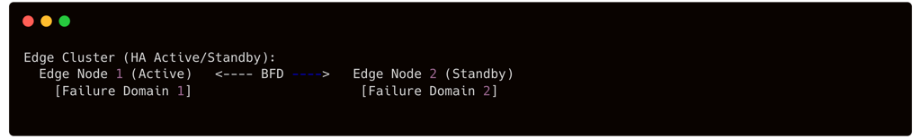 BFD Heartbeat: Edge VM supporta BFD min 1s (failover ~3s), Edge bare-metal supporta BFD min 300ms (failover ~0.9s).