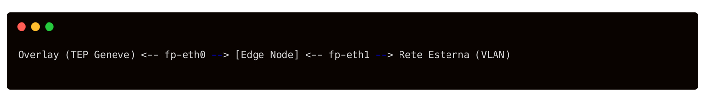 In una configurazione tipica, un Edge Node utilizza un’interfaccia fp-eth per le connessioni overlay e almeno un’altra fp-eth come uplink verso il Top-of-Rack o router fisico esterno. Ad esempio, fp-eth0 potrebbe essere assegnata al Transport Zone di tipo Overlay (terminando il Tunnel Endpoint Geneve dell’Edge Node), mentre fp-eth1 viene collegata a una Transport Zone VLAN per le reti esterne (instradamento su VLAN verso il TOR). In questo modo l’Edge Node inoltra il traffico tra il mondo virtuale (overlay) e la rete fisica esterna. Lo schema seguente illustra concettualmente questa separazione tra l’interfaccia overlay (TEP) e l’interfaccia uplink VLAN di un Edge Node: