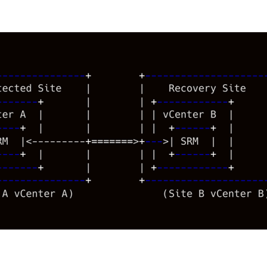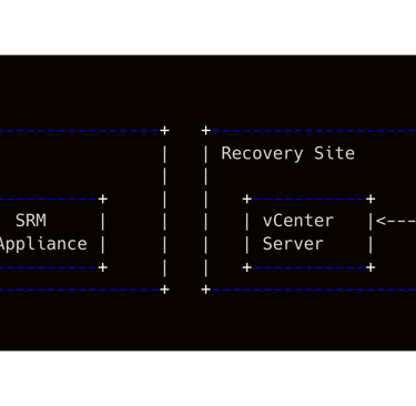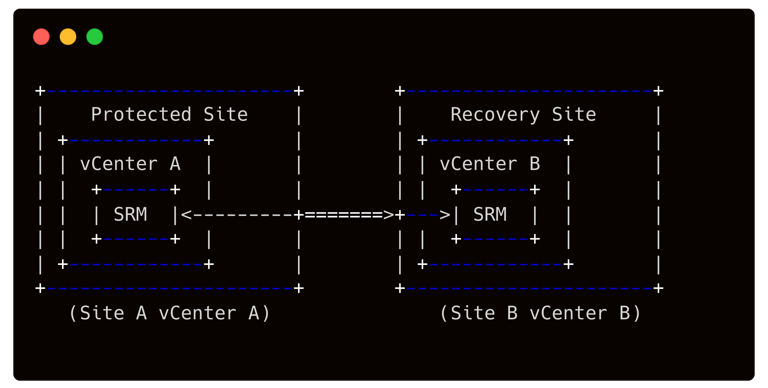 Nell’architettura tipica, ogni sito include un vCenter Server Appliance collegato a uno (o più) host ESXi, più l’appliance SRM installata su un host dello stesso cluster. I due siti SRM devono infine comunicare tra di loro. Il diagramma ASCII seguente illustra lo scenario base con due siti, ciascuno dotato di vCenter e di SRM:
